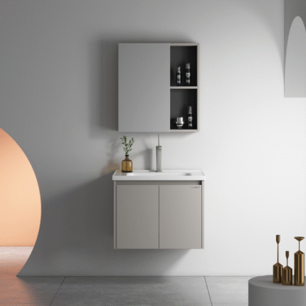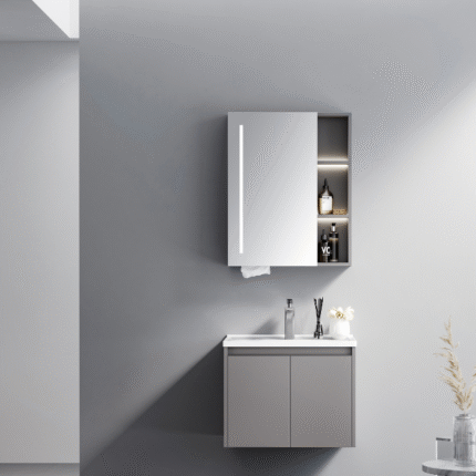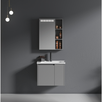 Gabinete Banheiro com Espelho, Pia e Armario Cinza Claro