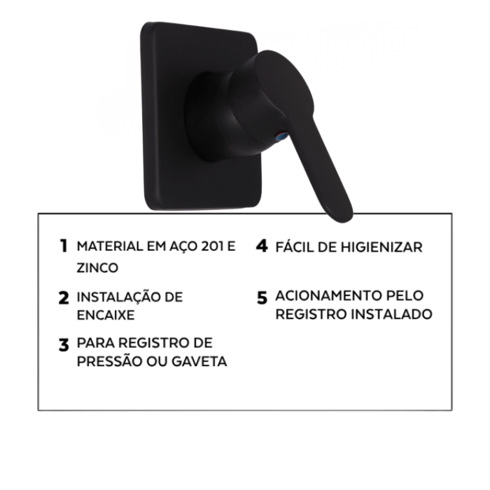 Desenvolvido para compor a linha de misturadores e registros, o acabamento permite o acionamento prático e confortável do sistema hidráulico, complementando o conjunto com elegância e segurança.