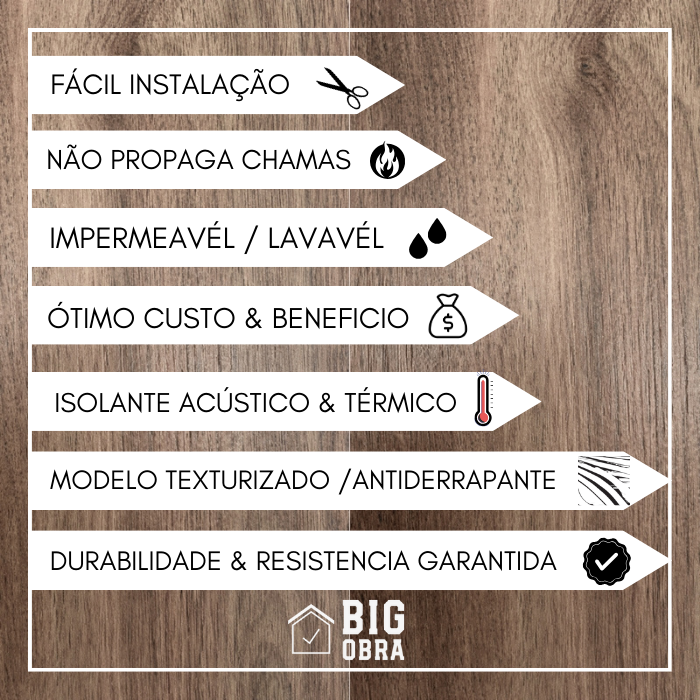 - Variedade de Padrões e Cores: Disponível em uma ampla gama de texturas que imitam madeira e pedras naturais, trazendo versatilidade para atender diferentes estilos e necessidades de decoração.